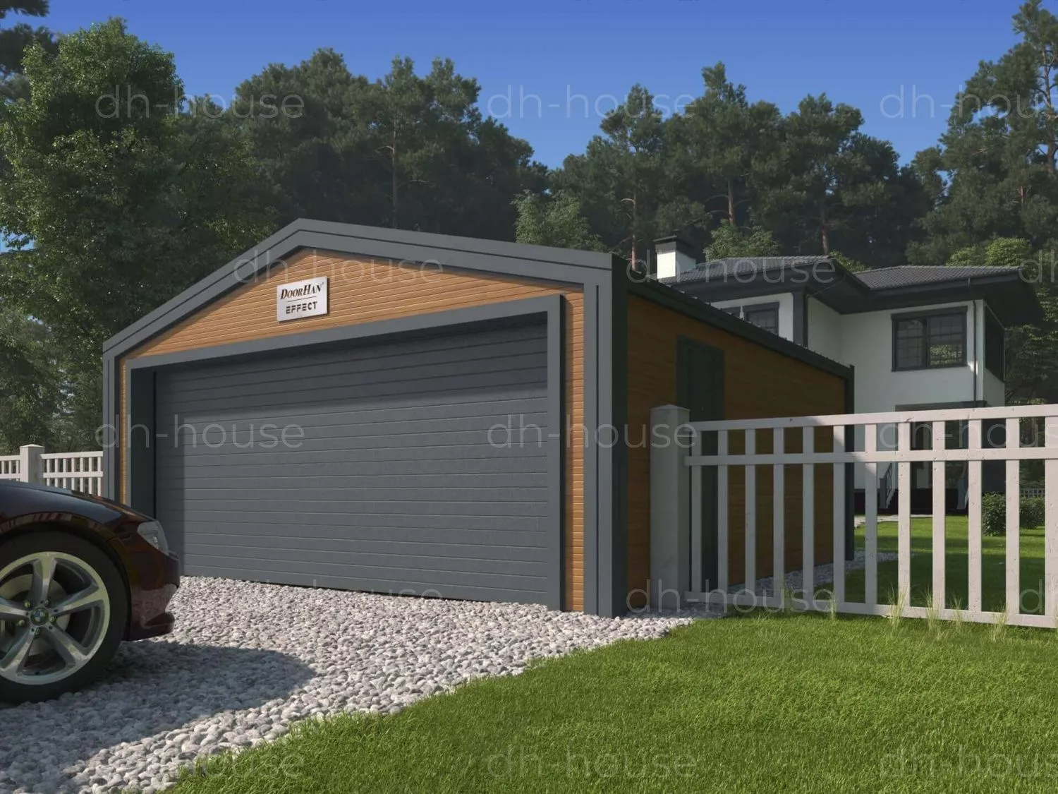 Гараж DoorHan представляет собой двускатное строение для стоянки автомобиля в Сочи. Выполнен в виде прямоугольной конструкции. Несущую функцию выполняет металлический каркас, собранный из профиля С-образной формы с оцинкованной поверхностью. Для обшивки кровли и стен выбраны PIR-панели. Цвета внешних стеновых панелей — золотой дуб, кровельных уличных панелей — RAL 7016, стен и кровли внутри — RAL 9003.