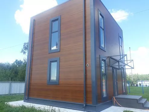 При строительстве быстровозводимого дома EFFECT LIGHT 88 используются современные, экологически безопасные материалы. Несмотря на визуальную компактность, внутри двухэтажного здания расположены просторные комнаты и хозяйственные помещения, способные обеспечить круглогодичное комфортное проживание семьи из 3–4 человек. Проект модульного дома предусматривает наличие высоких панорамных окон, оснащенных энергосберегающими стеклопакетами. Входная зона оборудована удобным крыльцом с навесом из поликарбоната. Дизайн фасада будет отлично сочетаться с различными стилями ландшафтного дизайна.